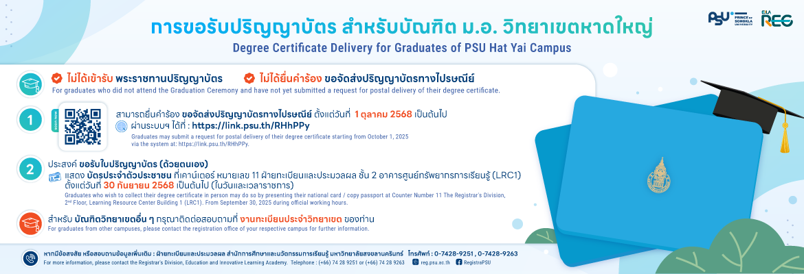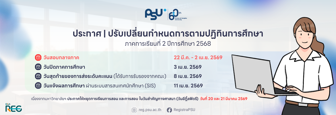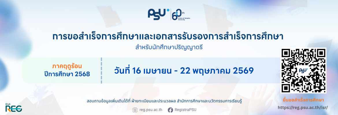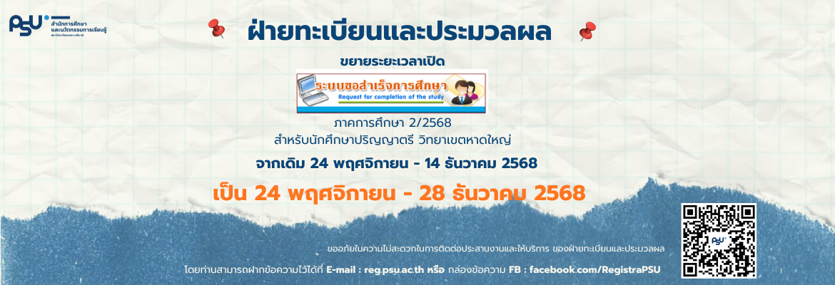 เรามีการใช้คุกกี้ที่มีความจำเป็นอย่างยิ่ง หรือเพื่อการทำงานของเว็บไซต์ และเครื่องมืออื่นๆ เพื่อช่วยเพิ่มประสบการณ์และเพื่อประสิทธิภาพในการใช้งาน คุณสามารถศึกษารายละเอียด นโยบายแนวปฎิบัติการใช้คุกกี้ มหาวิทยาลัยสงขลานครินทร์ ได้ที่ นโยบายคุ้มครองข้อมูลส่วนบุคคลcookies policy