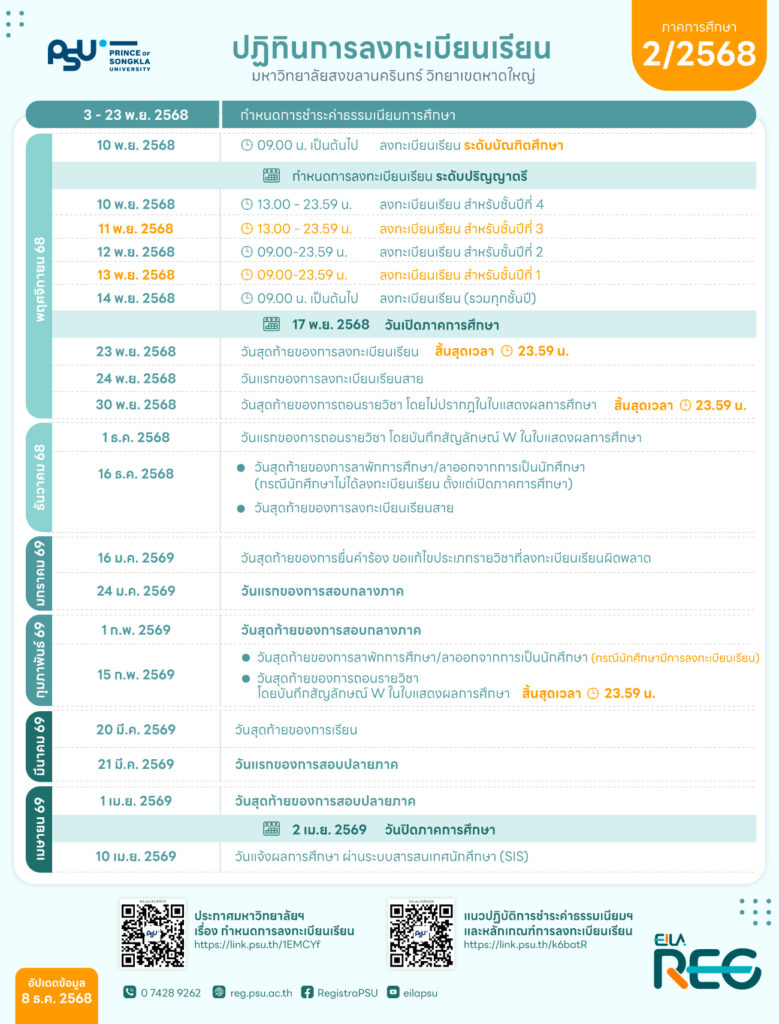 กำหนดการลงทะเบียน ภาคการศึกษาที่ 1 - 2 และภาคฤดูร้อน ปีการศึกษา 2568