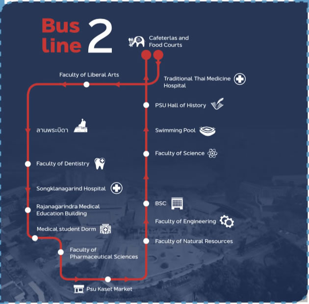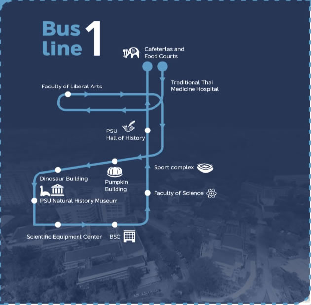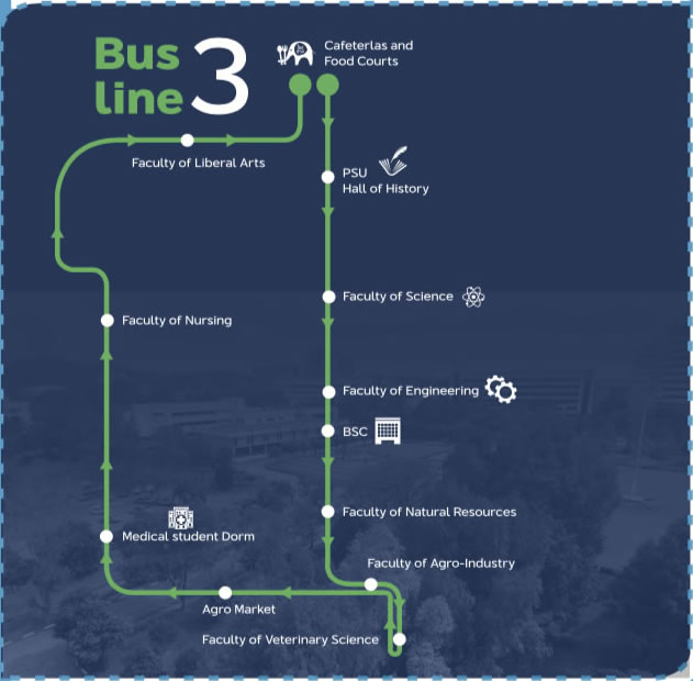 An electrical bus service operates on Hat Yai Campus throughout the day. Route maps are shown below.